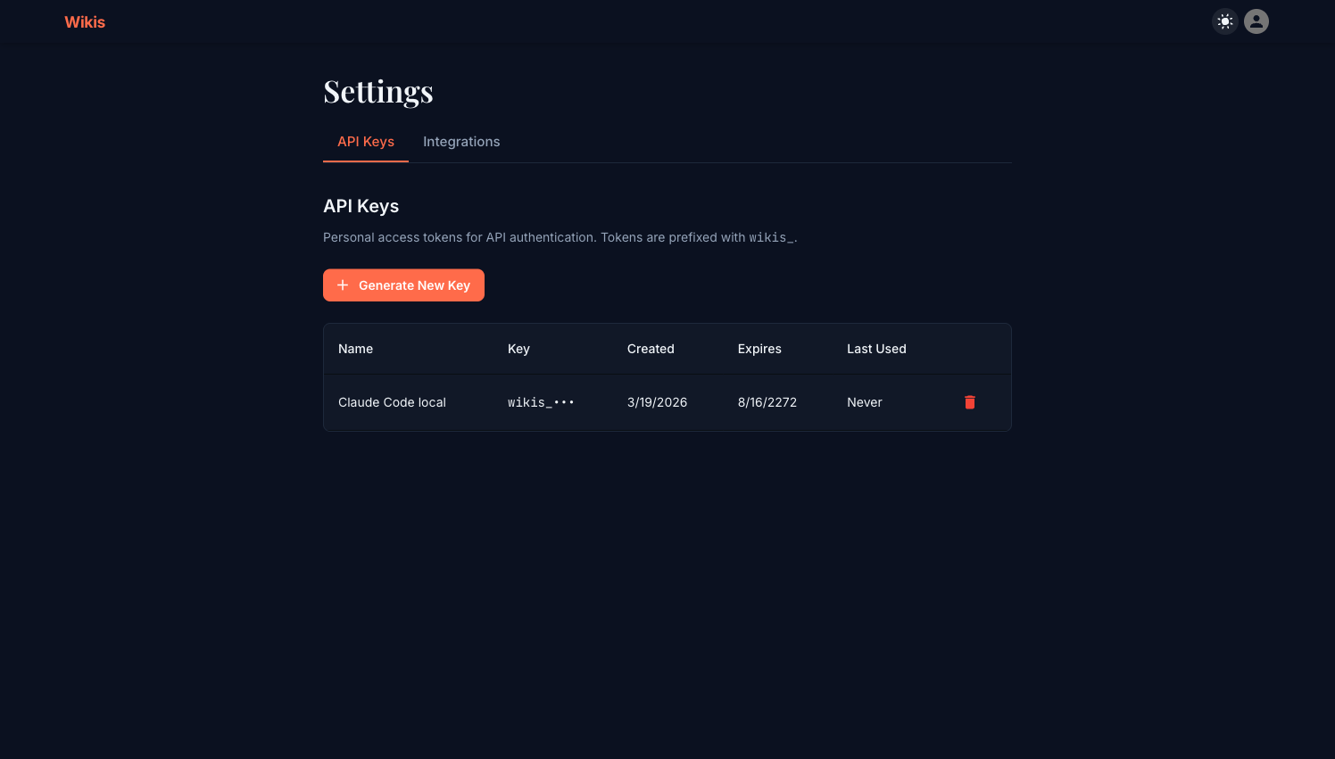 The full key value is shown only at creation time. If you lose it, revoke the key and generate a new one. Wikis stores only a hashed version of the key.