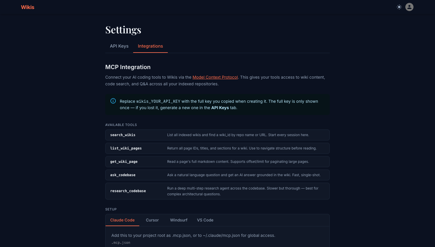 Wikis exposes a Model Context Protocol (MCP) server that gives your AI coding tools live access to every indexed repository — search wikis, read pages, ask questions, and run deep research directly from your editor.